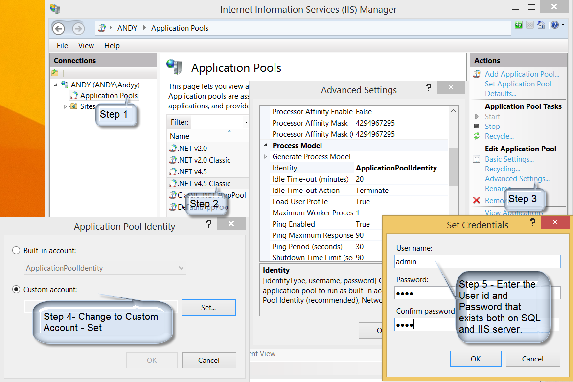 Cause The default identity for an application pool is ApplicationPoolIdentity. When a web application is created, the App_Data folder is not automatically configured to allow write access for ApplicationPoolIdentity. Therefore the attempt to write to the App_Data folder will fail. Resolution To work around this behavior, we can set a user that exists on SQL and IIS Server both.