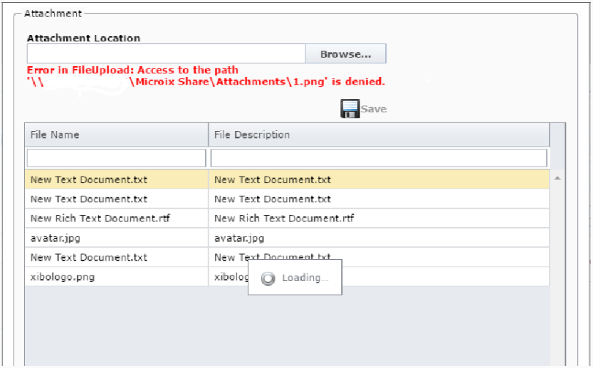 Issue: Issue: Microix Cloud and SQL are on 2 different server. Users are unable to attach/view document from Microix Cloud, Attachments are working from Client version. The error pop out very fast and unable to read as well. Attachment Folder can be browse from IIS Server. Attachment location in Microix is set to UNC Path. If we move Attachment folder to IIS server, attachment works. Symptoms As part of the application's request processing, it needs to write data to the App_Data folder on the server. For example, the application uses a SQLDataSource or XMLDataSource. When it attempts to do so, an error message is displayed: