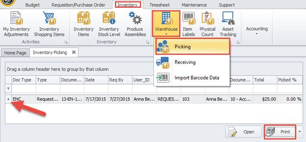 2. Select an existing document ready to be picked. If no items are listed here, you may need to first complete (and have approved) a new Request Items from Inventory document.
