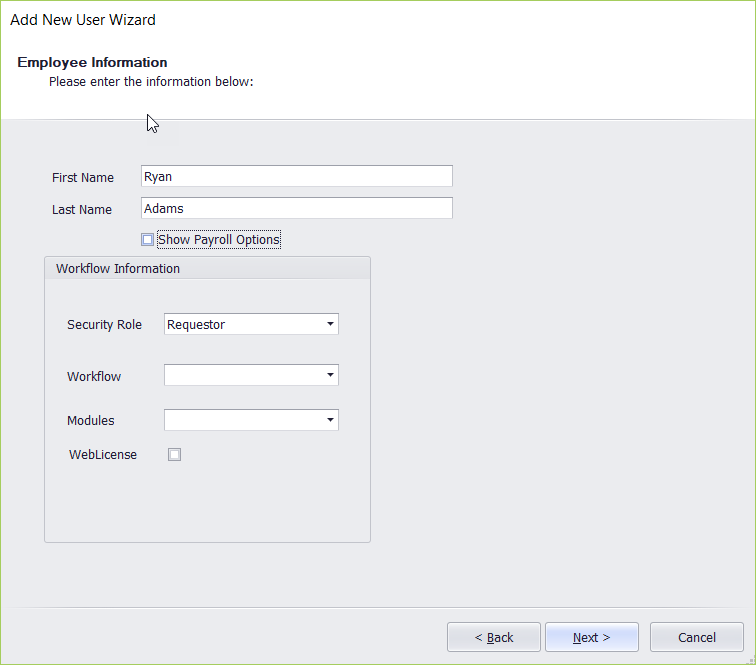 4. Enabling "Show Payroll Options" will enable Payroll Information on right side of the form.