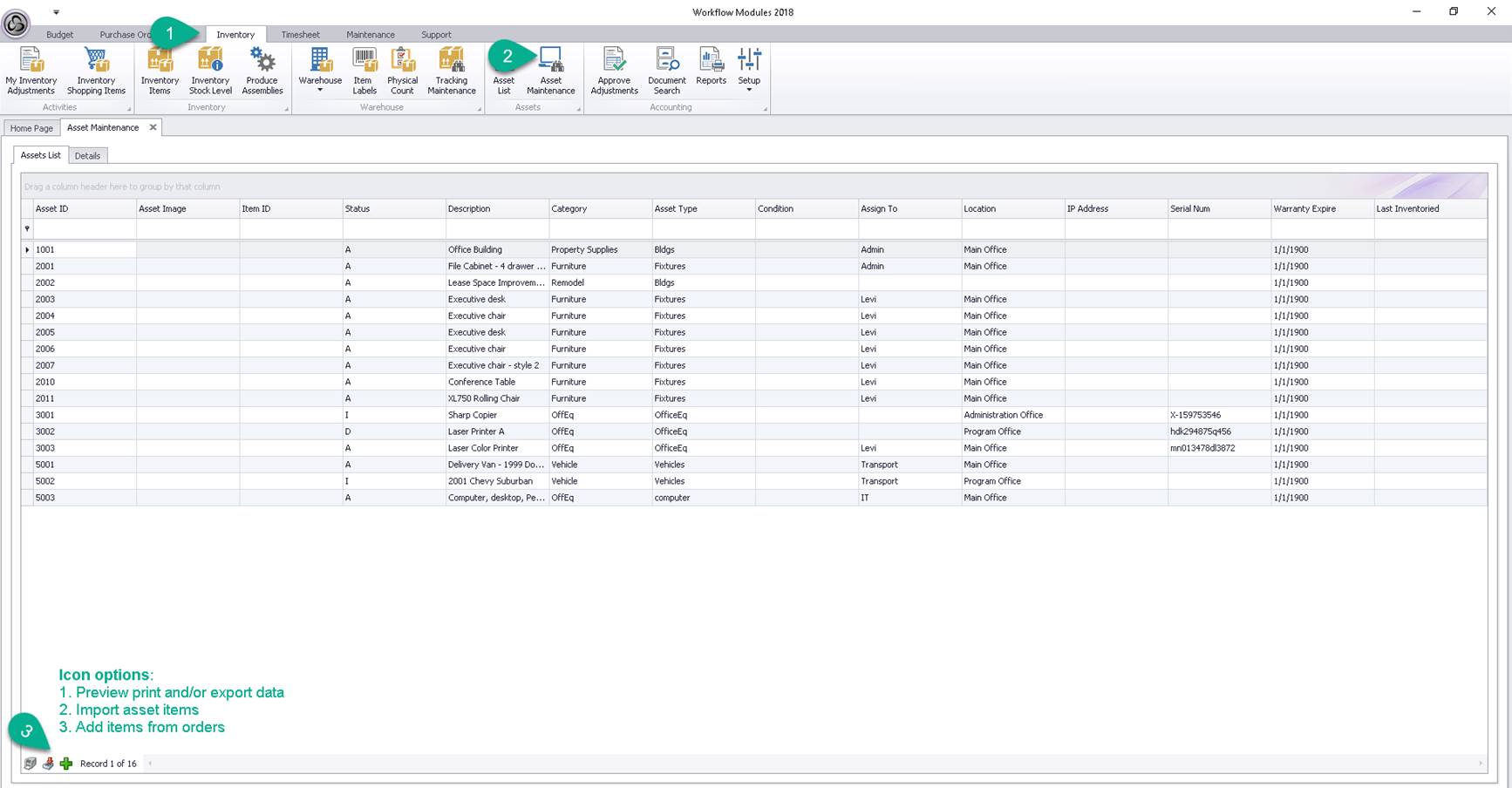Access the Asset List, from the Inventory menu tab.