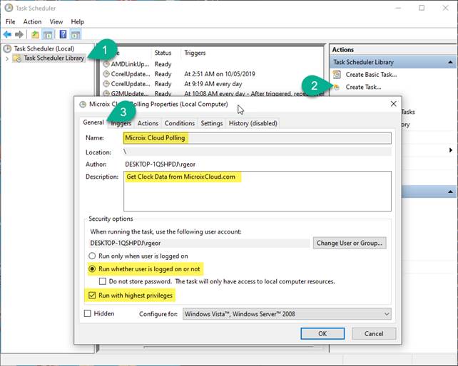 To begin the process, verify the version of workflow modules is 2019.1,1 or higher. Open the Windows Task Scheduler from the MIP/Microix Server and follow the steps to create a scheduled task to retrieve the time clock data from the MicroixCloud.com/tcm/ Time Clock Manager Server.