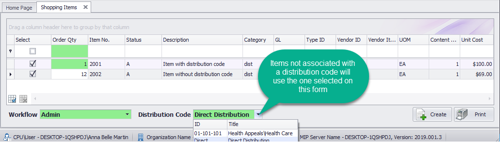 - With version 2019.001.3, multi-line distribution codes can be used when creating a purchase request from the Shopping Cart List. Previously, it was limited to single line distribution
