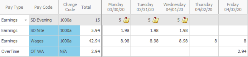 above, in Microix, accurately reflects the 5 hours (M-W) that fell within the Evening Shift Differential, and the 1.98 hours of Night Shift, for each day. Her regular total hours of 42.94, reflect her 3 days at 8.98 / day, and 2 days at 8 / day.