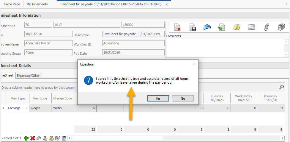 When employee’s submit their timesheet for approval, the statement will display allowing them to accept. The acceptance of the statement will also appear in the audit trial