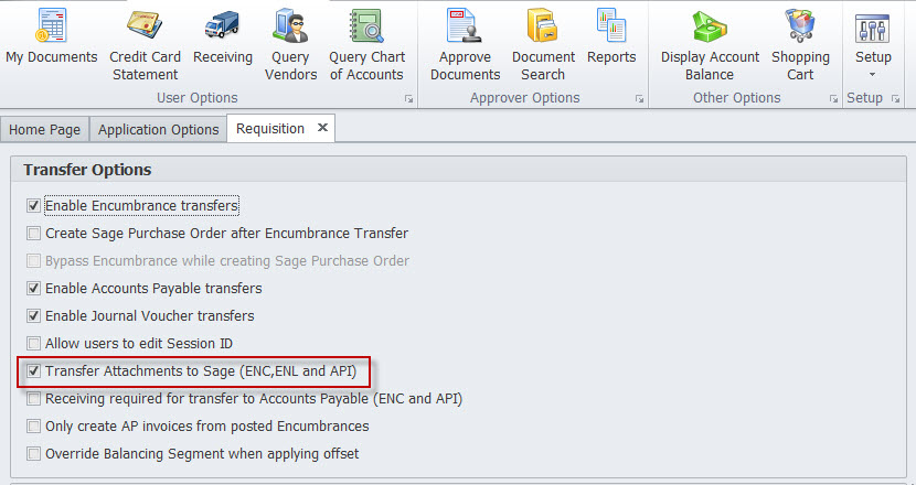 Step 1: Navigate to Maintenance - Setup - Requisition - Enable the option - "Transfer Attachments to Sage (ENC,ENL and API)".