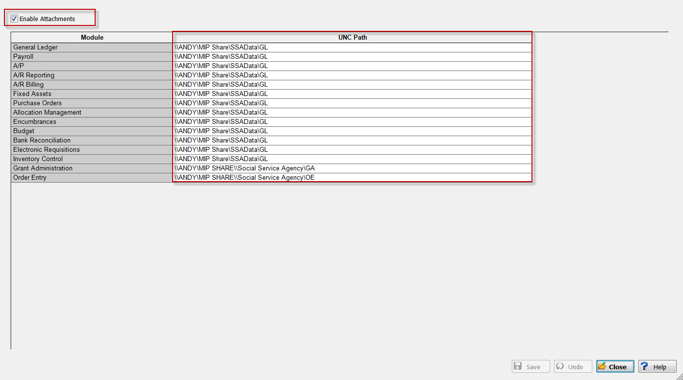 "Enable Attachments" should be checked and verify a valid UNC Path is specified for Encumbrance and Accounts Payable. If you get error while saving Attachment location page you may also have to correct UNC Path for other module as well and read/write permission should be granted for the windows account.