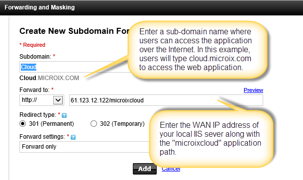 Note: Do not use above domain name, WANP IP, Local IP address and web address while configuring Microix Cloud on your server. This is just an example to explain how the domain needs to be configured. You will need to contact your IT guy to get all the above information.