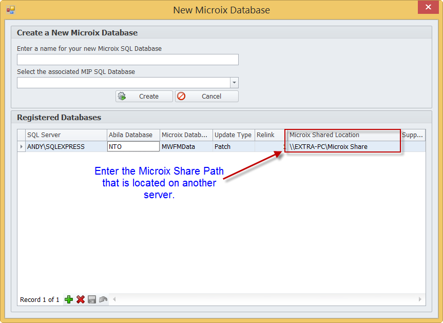 Step 2 : Navigate to Support – Create New Database – Enter the Microix Share path that is located on another server.