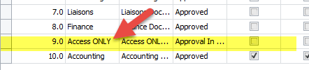 2. Create an "Access Only" approval level by navigating to the Maintenance>Global Options>Approval Level menu. Suggest using level 9 if available.