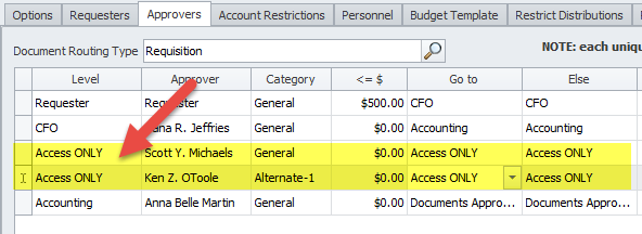 3. Modify your workflow approver's tab by adding the requesters to the newly created Access Only level as shown below. Use alternate-1,2,3 for additional users.