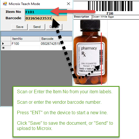 Open the Microix barcode application and navigate to Teach Mode. Scan or type your internal item number in the "Item No" field, next find the manufacturer's UPC code which is normally located on the product's packaging then scan the barcode and verify it appears correctly in the application "Barcode" field. Repeat this process for all of your inventory items.
