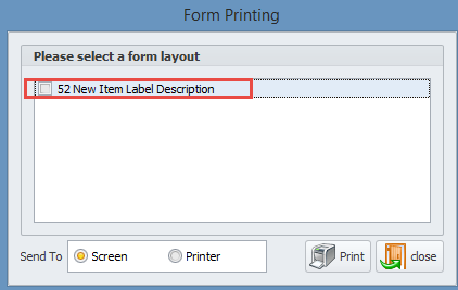 Microix allows formatting of item labels to meet custom label requirements. Utilizing forms designer, you will create a new format using a wizard for guidance. Then, you will need to add each field and its associated data to the label. Finally you will save and utilize this label at item label print time.
