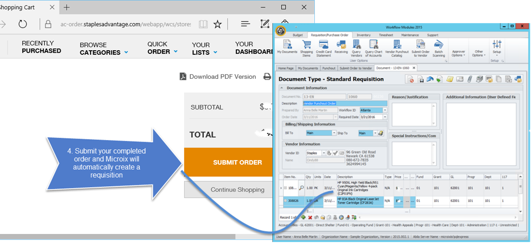2. When completed, follow the check out process (different vendors may vary) to complete the punch out process (an order is NOT generated on the vendor's website). The items in your shopping cart will be returned to Microix and a new document will be created in Microix. Navigate to requisition Tab>My Documents to find your new document. Once you find the new document, double click to open, review and then submit for approval.