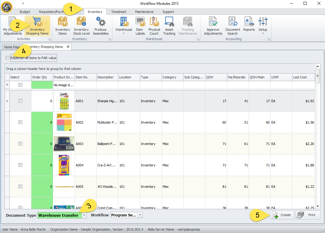 Follow the steps below to replenish all invenotry items to Par value. After performing step #4, you can edit each item in the grid to increase or decrease the Order Qty or un-select items you many not want to re-fill.