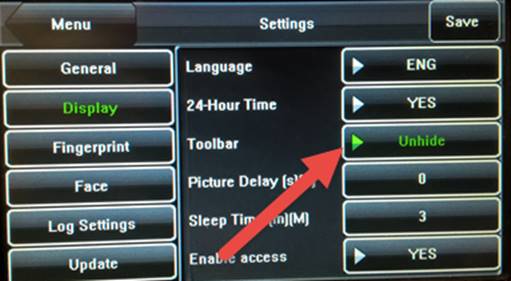 b. Navigate to Menu>Settings>Display and set the toolbar to “Unhide”