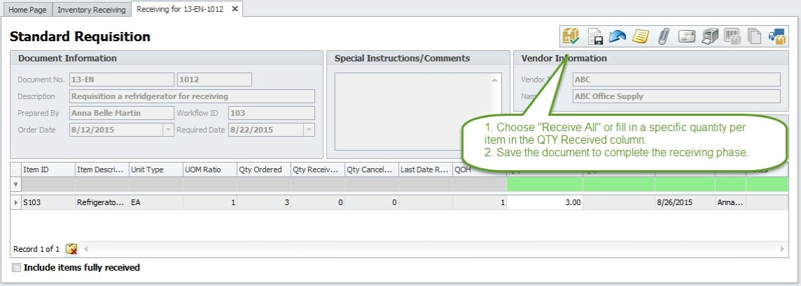 Receiving function notifies the system that the items in a purchase requisition have