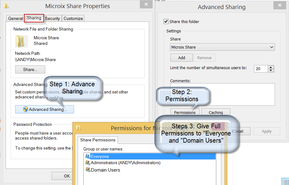 Microix will failed to back up the database if you have a permission issues. We recommend to give "Everyone" and Domain users" full permission to your Microix Share Folder under "Share" and "Security" tab.