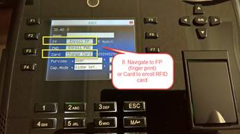 6. After finding the employee, press the M/OK and navigate to FP to enroll FINGERPRINT or CARD to register RFID Card