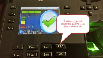 7. If enrolling fingerprint, follow instructions on screen until you get a successful enrollment. The system will ask you to place your finger 3 times on the reader