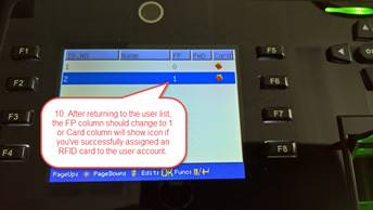 8. A successful enrollment will show 1 in the FP column and a card icon when registering an RFID card. Repeat the 4-8 to enroll other users.