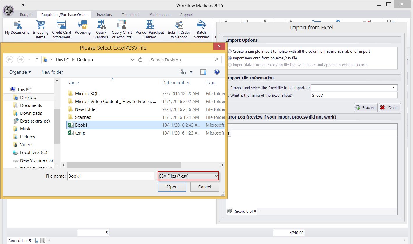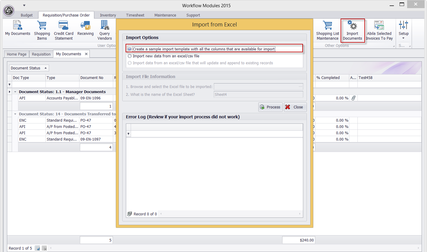 Navigate to Requisition – Import Documents and select the option "Create a Sample Import Template". The system will generate an excel template with all columns related to your database of information that can be imported. Once the template is created delete the existing lines and start entering data for new documents. Use the second option “Import new data….” to import data into Microix. The template can be used as a onetime import or used to import data periodically. The template can be used to create ENC and Regular API. Use the words "To Be Assigned" in the document column if you would like Microix to auto generate document numbers. Data format is important, if a column is associated with numeric values, must use 0 if no value is being imported. For alpha numeric values, use "N/A".