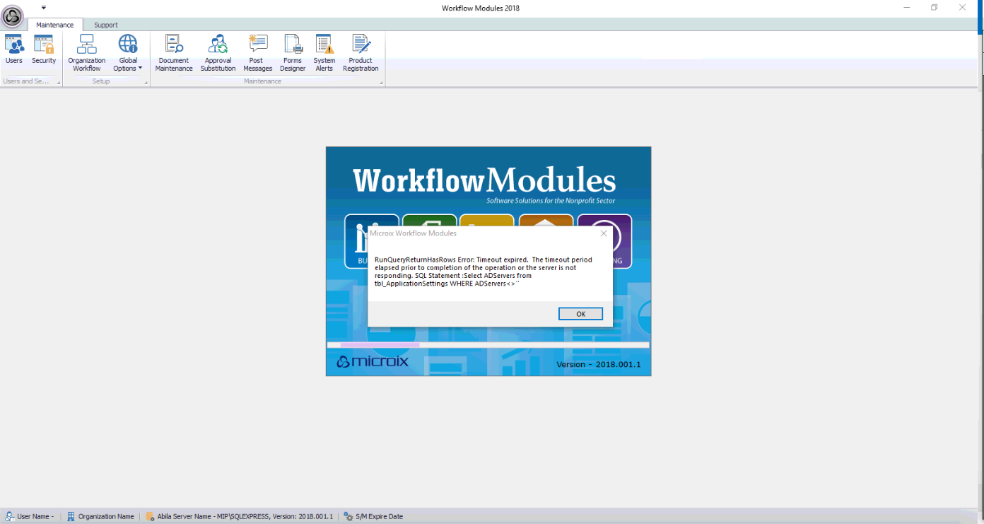Issue :RunQueryReturnHasRows Error: Timeout expired. The timeout period elapsed prior to completion of the operation or the server is not responding. SQL Statement: Select ADServers from tbl_ApplicationSettings WHERE ADServers<> error on Login Page of Microix, but customers are still able to login, They do not get this error when login on to SQL Server.