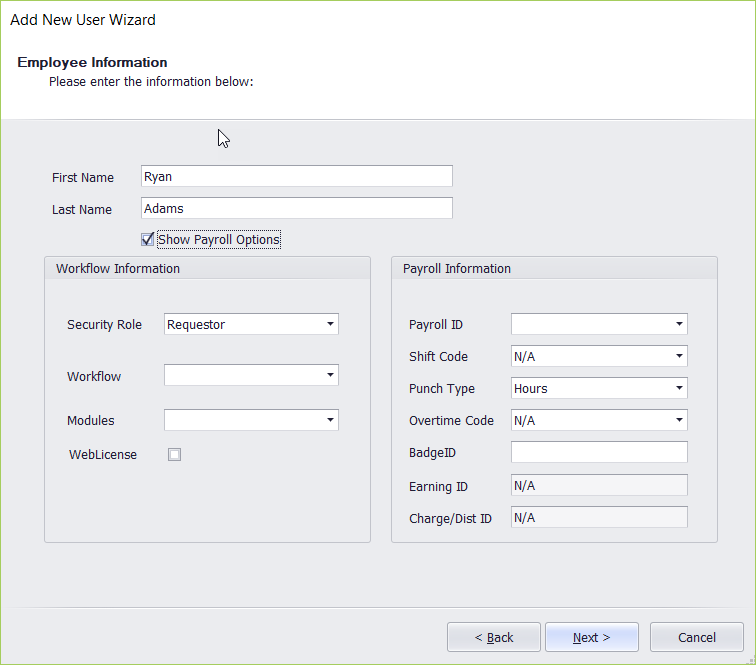 4. Enabling "Show Payroll Options" will enable Payroll Information on right side of the form.