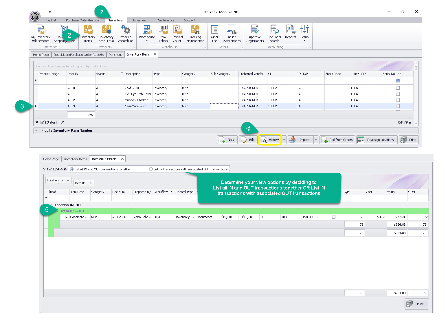 Show the history for inventory items, apply the following:1. Navigate to the Inventory menu tab