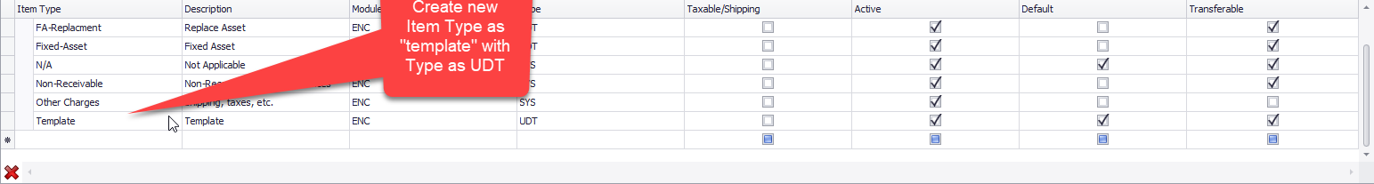 Step 1: Navigate to Maintenance - Global Settings - Terminology and create Item Type as "Template"
