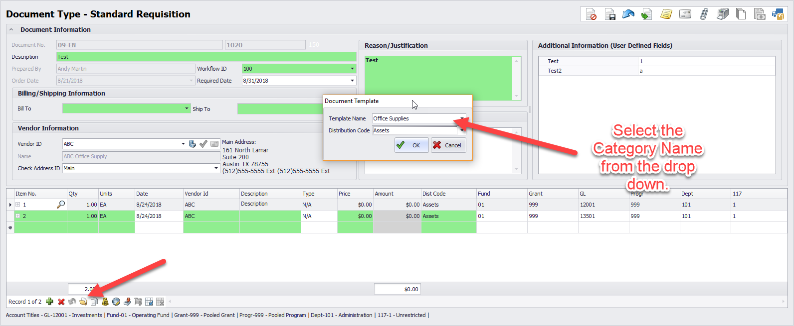 Step 3: Click on Folder icon on your Purchase Order and select the Template from the drop, this should populate all the line items from the same category.