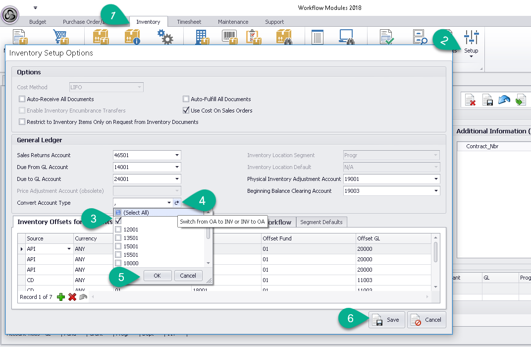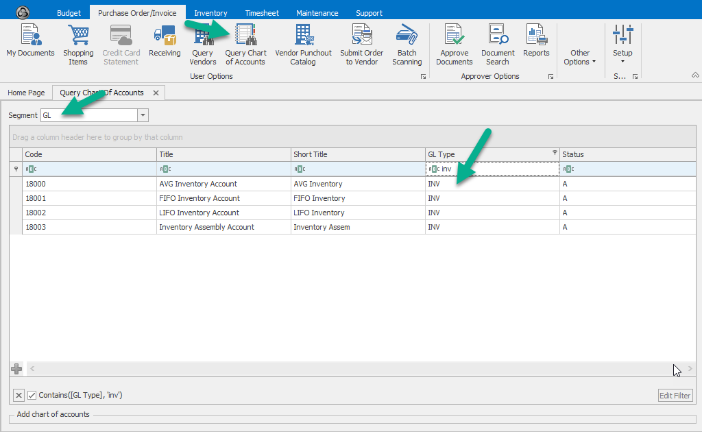 Verify the results which should show “OA” or "INV" if process completed successfully.1.Select Purchase Order/Invoice menu tab2. From the menu select Query Chart of Accounts3. Sort the GL Type column to verify the account change