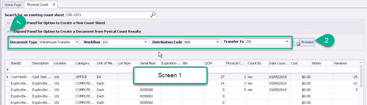 Process 1. Navigate to the Inventory Tab>Physical Count form. Create a physical count sheet for the location where inventory will be removed and select the option