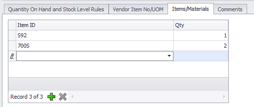 Used by assembly type items to product finished goods. These types can be included on a purchase order but cannot be used to dispense internally or sell