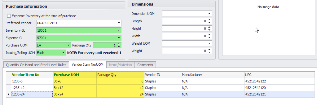Step 2. Navigate to Inventory>Inventory Items, edit the inventory item in question and complete the Vendor Item No/UOM table