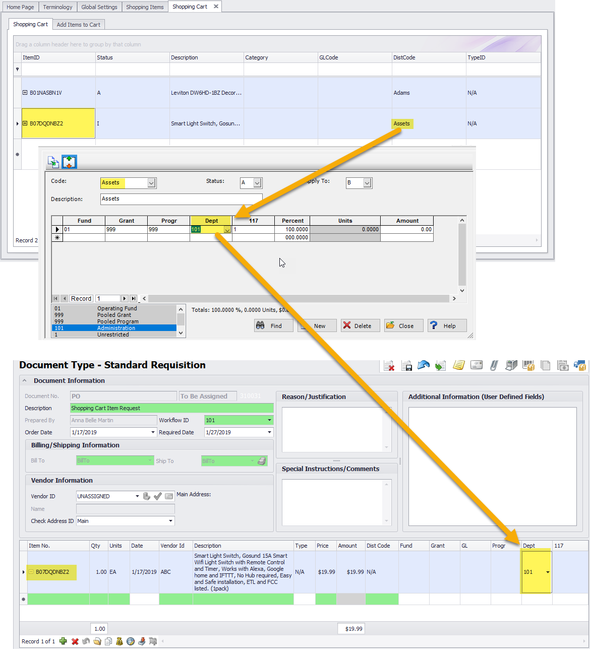 When you create a purchase order from the shopping list, the department value from the associated item’s distribution code will be used on the purchase order. If the distribution code has multiple lines, it will use the first row value and ignore the remaining lines of the distribution code.