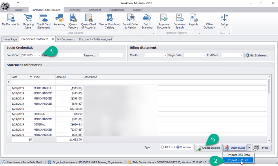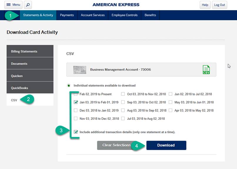 Single File Import;Step 1. Login to American Express online account and download your statement using csv file format