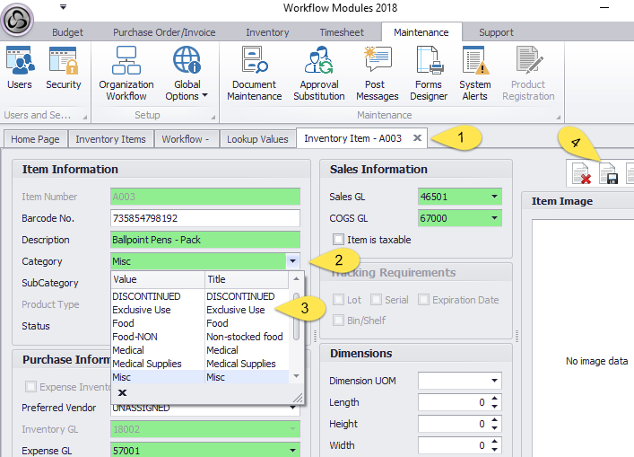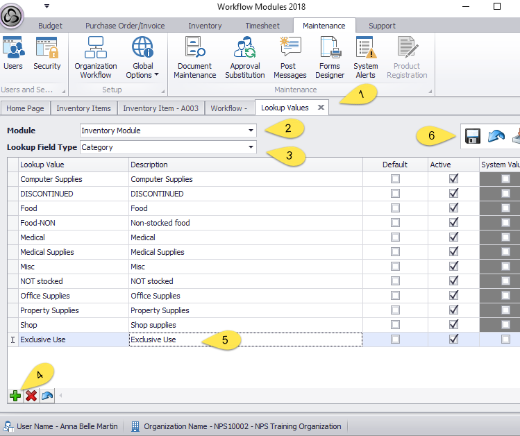 Create new category: Maintenance > Global Options > Global Lookup > Inventory Module > Lookup field Type=Category