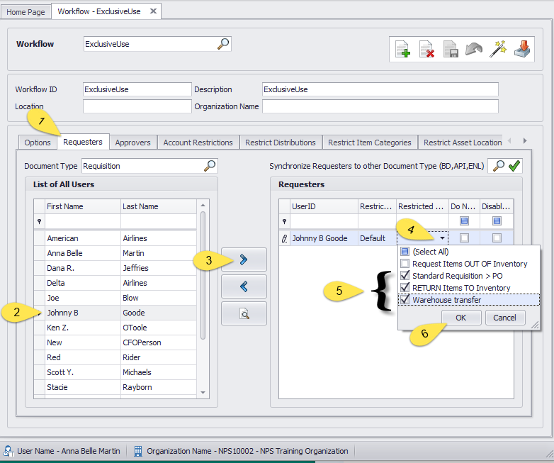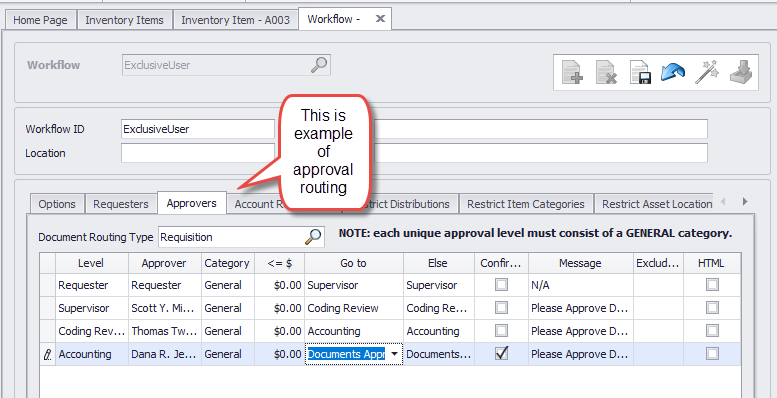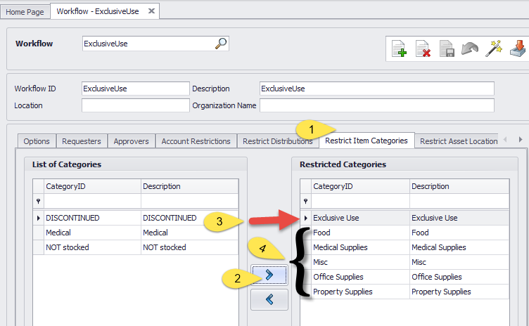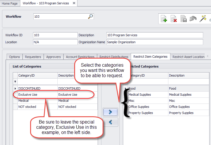 On the Restrict Item Categories tab select the category(s) that you want the user to be able to request from inventory. It could be just one category, the new special category, and you could select additional categories or even all categories, according to your judgment.