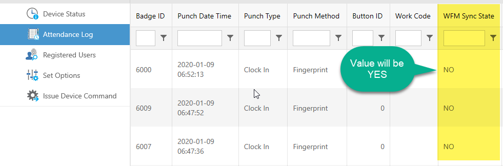 https://Microixcloud.com/tcm website and verify the attendance record has "YES" for under the column WFM Sync State.