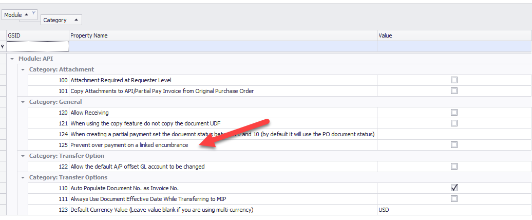 Global option 125 - the following will be prohibited during the entry of an API invoice against a Microix encumbered purchase order