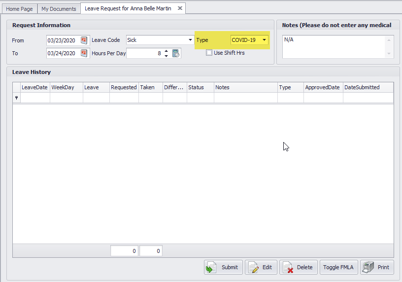 2. Ask employees to choose the “COVID-19” as the Type ONLY when the Leave is related to COVID-19