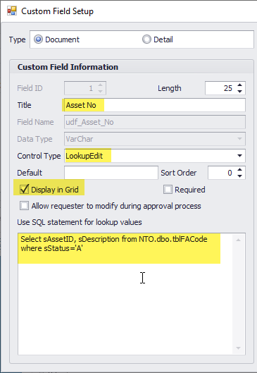 1. Create “Asset No” User Defined Field and set the control type to “LookupEdit”. Use the SQL script below to populate the UDF with a list of MIP’s active assets.