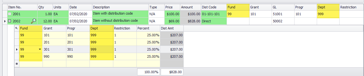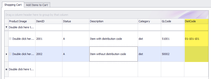 - Item 2002 will use the distribution code selected from the shopping list because a distribution code was not assigned to the Item