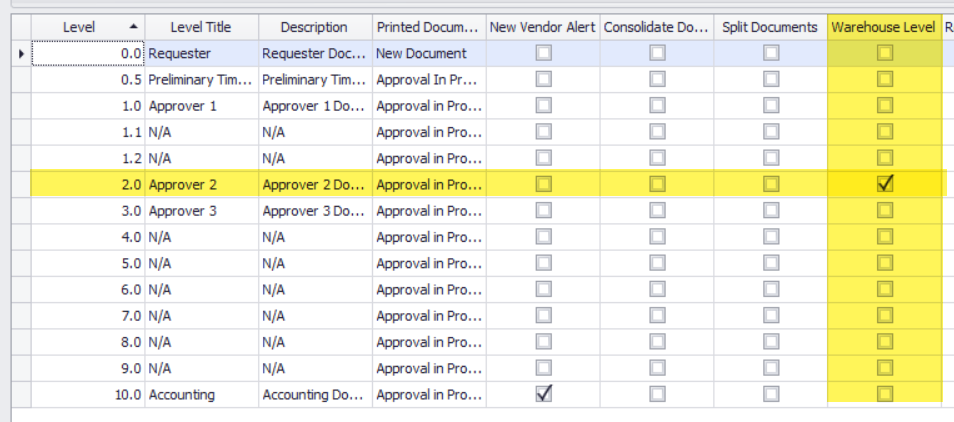 If you need to change the default behavior, you can control which level is appropriate for purchase orders to start showing by navigating to Maintenance>Global Options>Approval Level Title. You then place a check mark under the “Warehouse