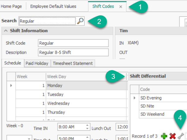 Rules, Setup an appropriate 'Regular' shift. More details on establishing Shifts can be found on the Shift Code Tab. However, in order for the Shift Differential feature to work properly, note the following settings (1-4) that must be configured.
