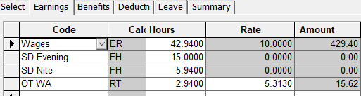 above, in Microix, accurately reflects the 5 hours (M-W) that fell within the Evening Shift Differential, and the 1.98 hours of Night Shift, for each day. Her regular total hours of 42.94, reflect her 3 days at 8.98 / day, and 2 days at 8 / day.