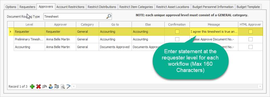 Follow the steps below to add an affirmative statement to all workflows who may need to accept the statement before timesheets are submitted: