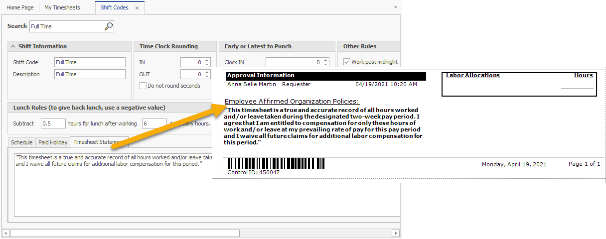 Expanded statement can be added to the printed timesheet using the Shift Codes>Timesheet Statement tab: