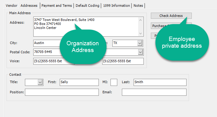 To hide employee home address from Microix users, change the main address in MIP to reflect the organization address and enter the employee mailing address in the Check address. Microix users can only see vendors main address values.